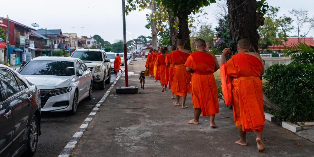 The daily alms rounds are an important part of Theravada Buddhism and a common ritual for monks across Thailand. As the sun rises, they head out into the streets from the monasteries, a large bowl in their hands. Traditionally, the monks did not have paid employment or engage in their own agricultural work, so the local people would donate food, putting into the bowls what the monks would need to eat for that day.